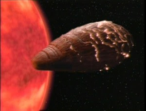 Then we have Tin Man, a living ship (a concept that will be a huge part of the series Farscape a few years down the line), a being so old and lonely that it was hanging around a soon-to-be-supernova because it wanted to die. It was obvious from the start that Tam and Tin Man/Gomtuu would end up together, fulfilling each other's most basic needs -- peace and quiet for Tam's mind, a new crew for Tin Man to serve. Although I did like the way Tam was so much calmer on Gomtuu, caressing its walls to the point of merging with them, the way Gomtuu created a chair out of the floor for Tam.
